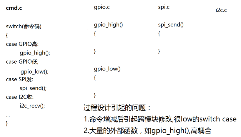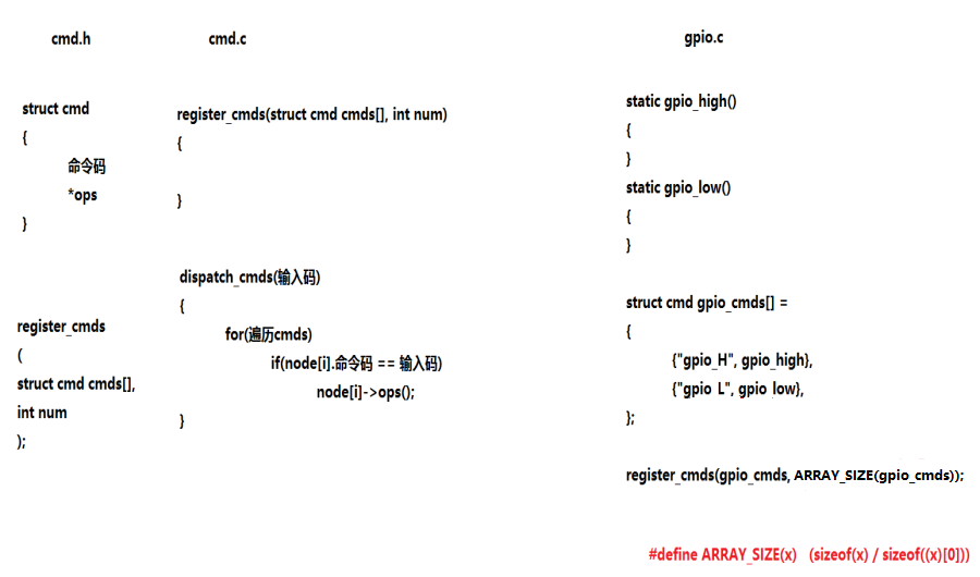 面向对象的设计思想,把命令看成一个对象,将命令码和命令操作绑定到一起。提供一个统一的注册接口。这样设计代码后,很明显的gpio的代码更内聚了。cmd和其它模块之间的耦合性也降低了。新增其它模块也不需要修改已有代码了。