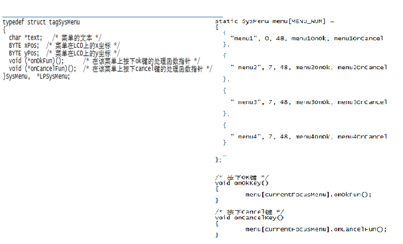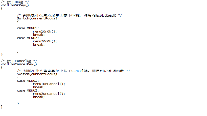 如上图所示,是确认键和取消键的功能函数,但是对应的每一个菜单都会有不同的处理函数,每新增加一个菜单处理,就需要加一条switch-case。当菜单越来越多,就会有大量的switch-case代码去匹配具体的操作。